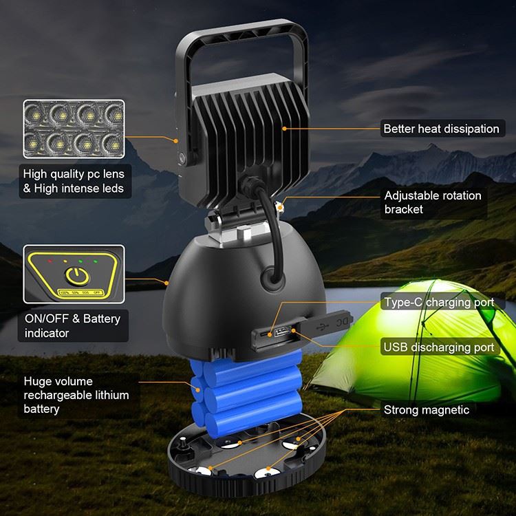 2. Vodoodporna: Flood Light ima vodoodporno in odporno zasnovo. IP65 Vodoodporen, zato lahko delovna luč deluje v slabem vremenu. Idealno za popravilo avtomobilov, kampiranje, ribolov, zasilno razsvetljavo...